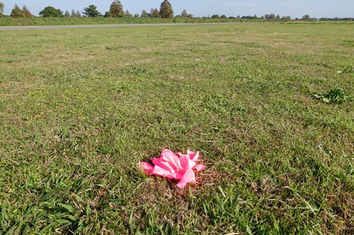 飛行場に行くときれいに広がるグラスエリアにピンクのリボンが